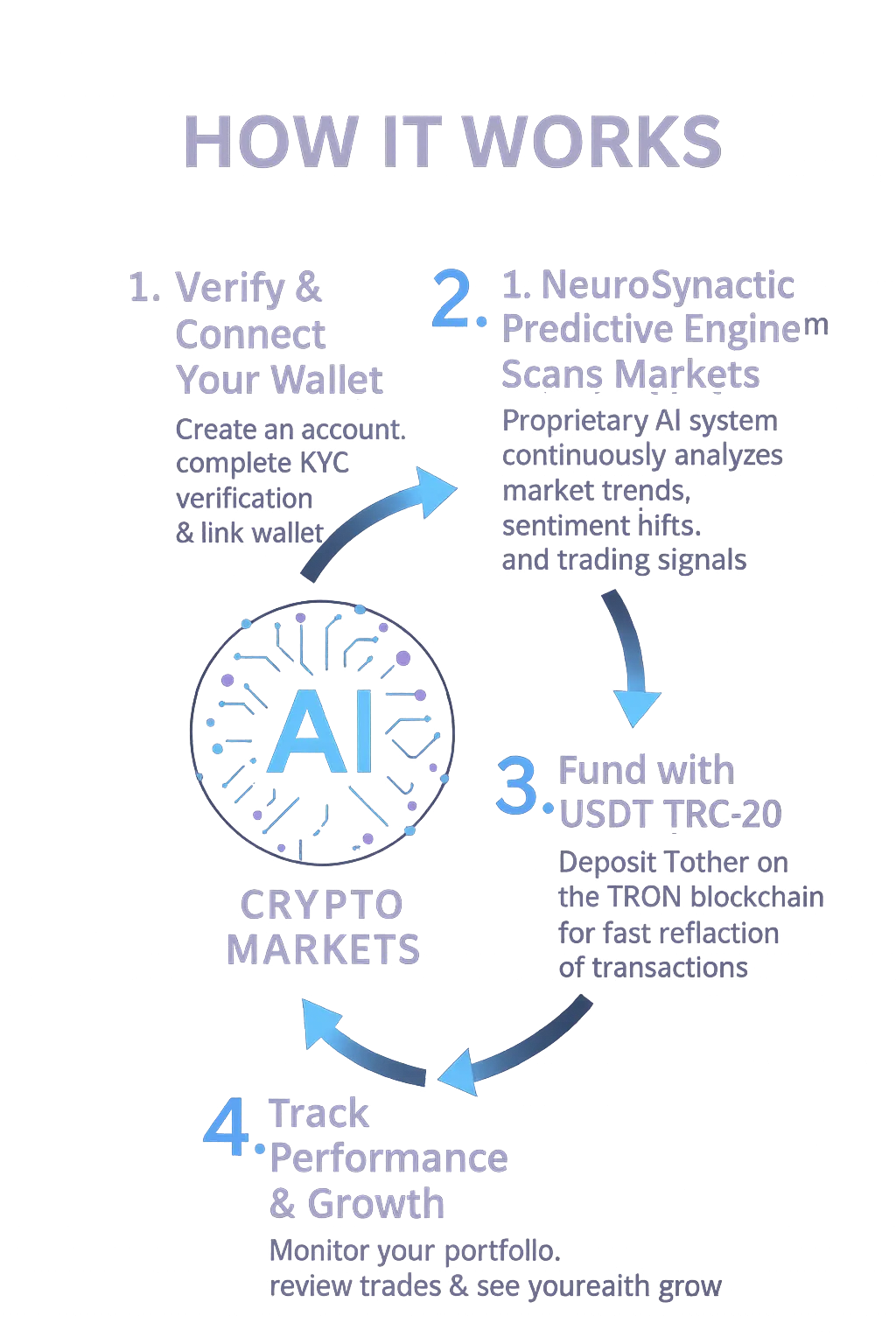 Simply create an account, verify your wallet, fund it with USDT (TRON), and choose your investment plan. Our AI takes care of the rest.